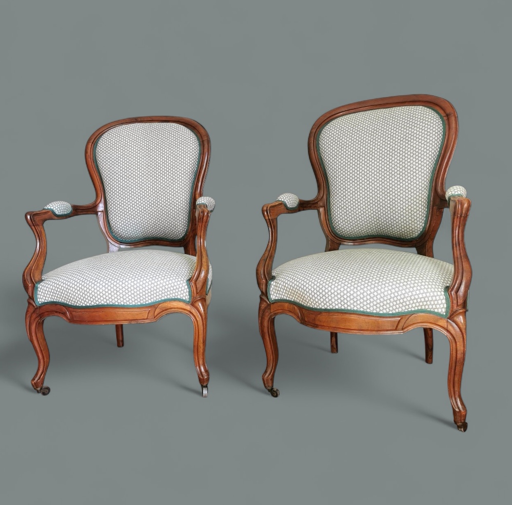 Voici deux fauteuils cabriolets Louis-Philippe à nouveau bien dans leur époque et leurs roulettes avec ce tissu vert tendre à petits motifs de l'éditeur Prestigious Textiles orné d'une finition passepoil des Passementeries d'île de France.