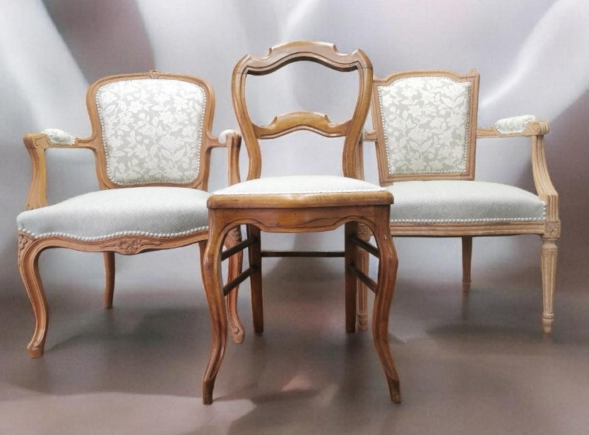 3 styles, 3 époques et maintenant une belle unité pour ce petit héritage, porteur de toute une mémoire familiale, mis à l'honneur avec réfection complète en garniture traditionnelle, ressorts, toiles et crins..